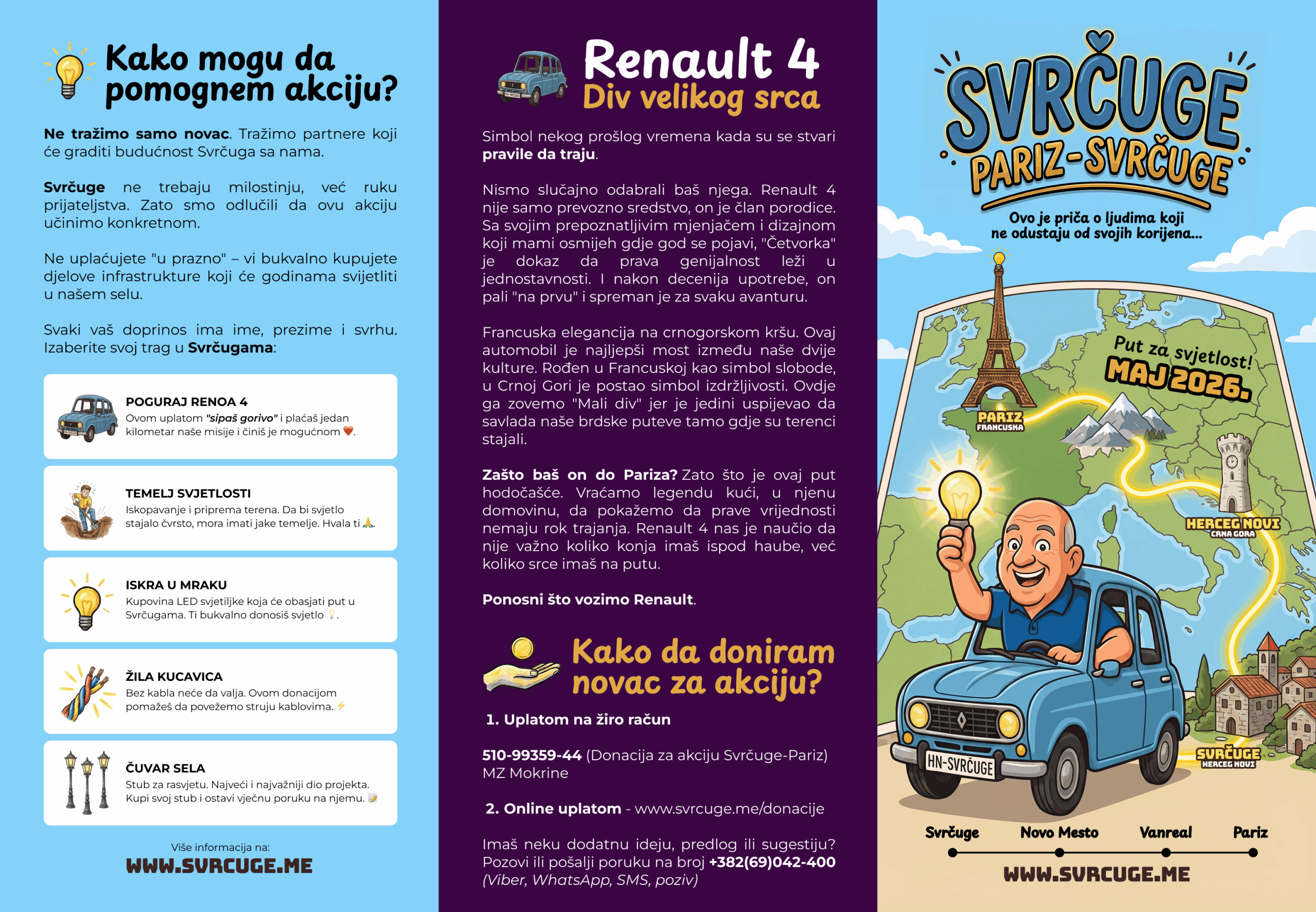 Kako bi skrenuli pažnju javnosti na ovaj problem, ali i pokazali da se velike ideje mogu roditi u malim mjestima, mještani i prijatelji Svrčuga kreću na put dug oko 5.000 kilometara – od Svrčuga do Pariza – legendarnim Renaultom 4.