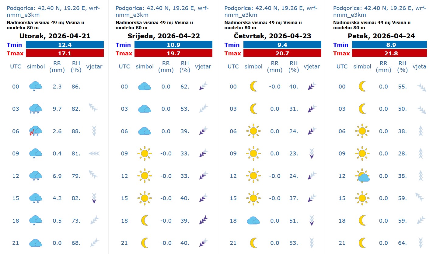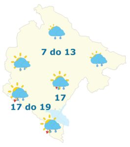 Podgorica: Promjenljivo, uz povećanu oblačnost povremeno ima uslova za kišu. Vjetar slab do umjeren, najčešće južni. Jutarnja temperatura vazduha oko 12, najviša dnevna oko 20 stepeni.