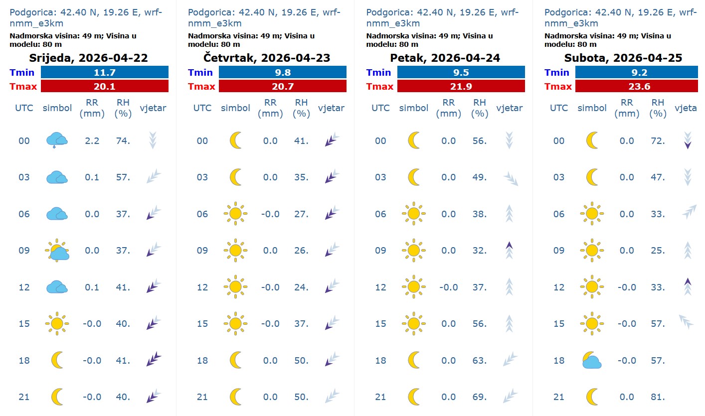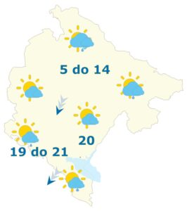 Podgorica: Pretežno oblačno, povremeno kiša, mogući pljuskovi i grmljavina. Vjetar slab do umjeren, promjenljivog smjera, tokom noći sjeveroistočni, umjeren do pojačan. Jutarnja temperatura vazduha 13, najviša dnevna oko 17 stepeni.
