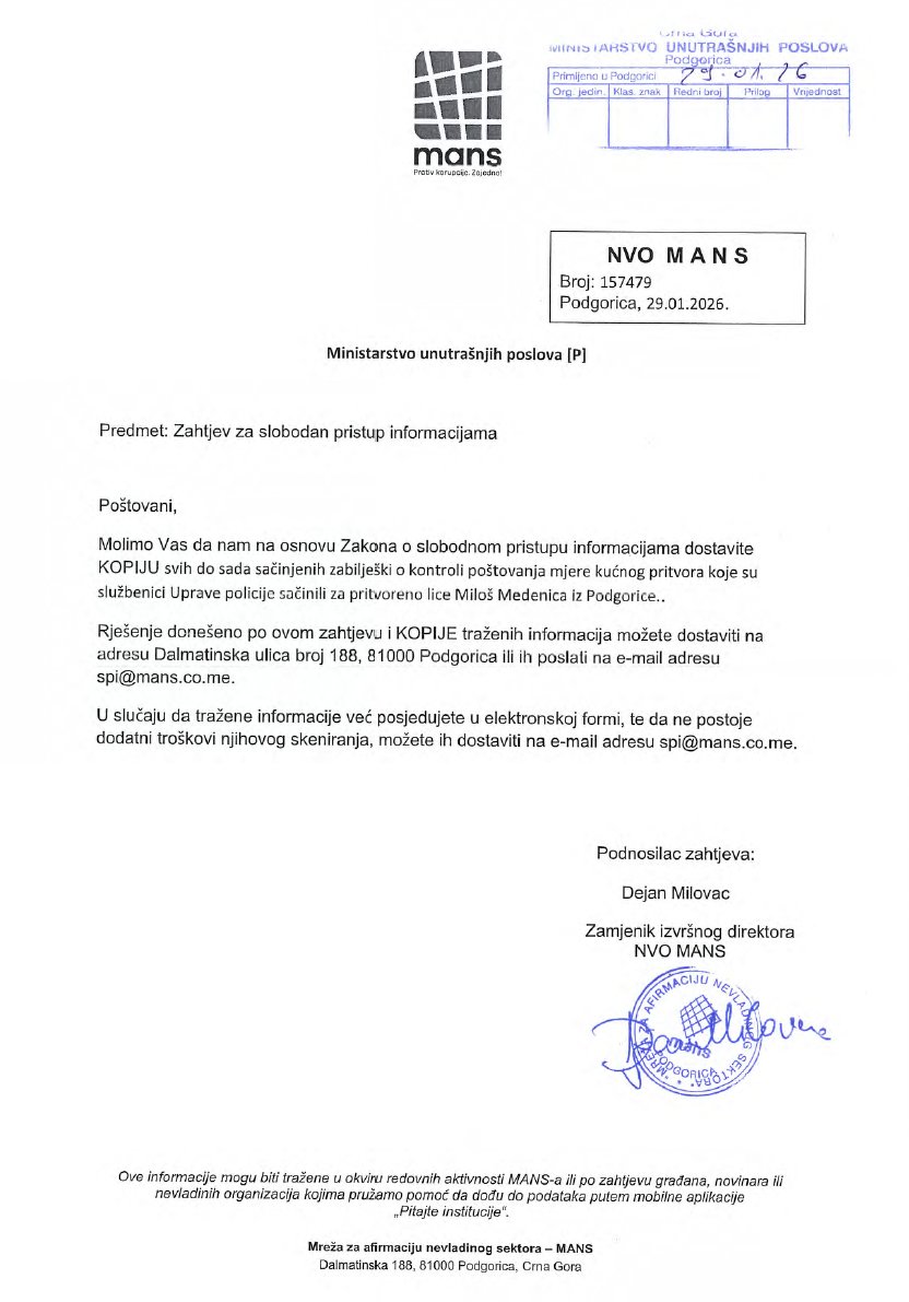 Mreža za afirmaciju nevladinog sektora MANS je danas od Ministarstva unutrašnjih poslova zatražio objavu informacije o svim do sada sačinjenim zabilješkama o kontroli poštovanja mjere kućnog pritvora za Miloša Medenicu.