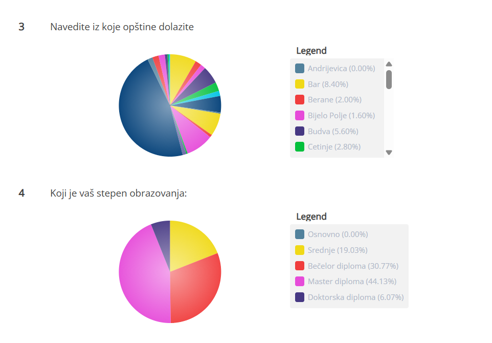 Podaci su pokazali da je na upitnik odgovorilo najviše građana iz Podgorice (46,80 odsto), zatim slijede Nikšić (8,80 odsto), Bar (8,40 odsto), Kotor (7,20 odsto), Budva (5,60 odsto) Herceg Novi (5,40 odsto)…