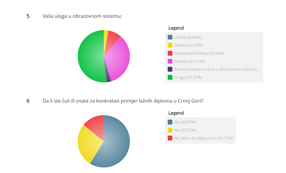 Za konkretan primjer lažnih diploma u Crnoj Gori čulo je 58,87 odsto ispitanika, 27,02 odsto nije čulo, dok njih 14,11 odsto nije željelo da odgovori.