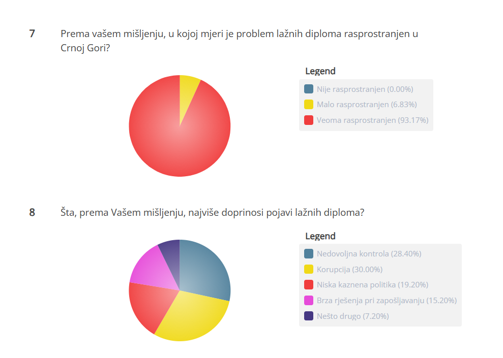Lažne diplome predstavljaju veliki i veoma ukorijenjen problem u crnogorskom sistemu. U prilog tome govore rezultati upitnika koji je sproveo CdM, a na koji je čak 93,17 odsto ispitanika odgovorilo da je ovaj problem vrlo rasporostanjen u našoj zemlji. Tek 6,83 odsto smatra kako je malo rasprostranjen, dok nijedan građanin nije naveo da lažne diplome uopšte nijesu prisutne u našem društvu.