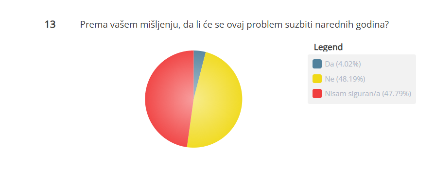 Na samom kraju upitnika, pitali smo ih smatraju li da će se ovaj problem suzbiti narednih godina. Odgovor “ne” dalo je 48,19 odsto ispitanika, odgovor “nisam siguran” izabralo je 47,79 odsto, dok je opciju “da”, izabralo 4,02 odsto ispitanika.