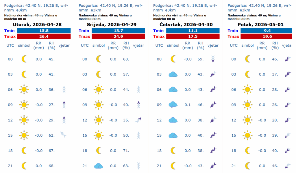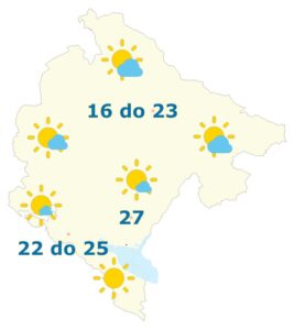 Podgorica: Sunčano. Vjetar uglavnom slab, promjenljivog smjera. Jutarnja temperatura vazduha oko 12, najviša dnevna oko 27 stepeni.