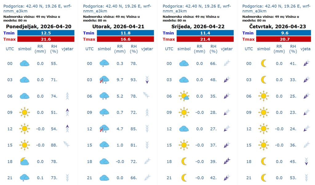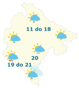 Podgorica: Promjenljivo, uz povećanu oblačnost povremeno ima uslova za kišu. Vjetar slab do umjeren, najčešće južni. Jutarnja temperatura vazduha oko 12, najviša dnevna oko 20 stepeni.