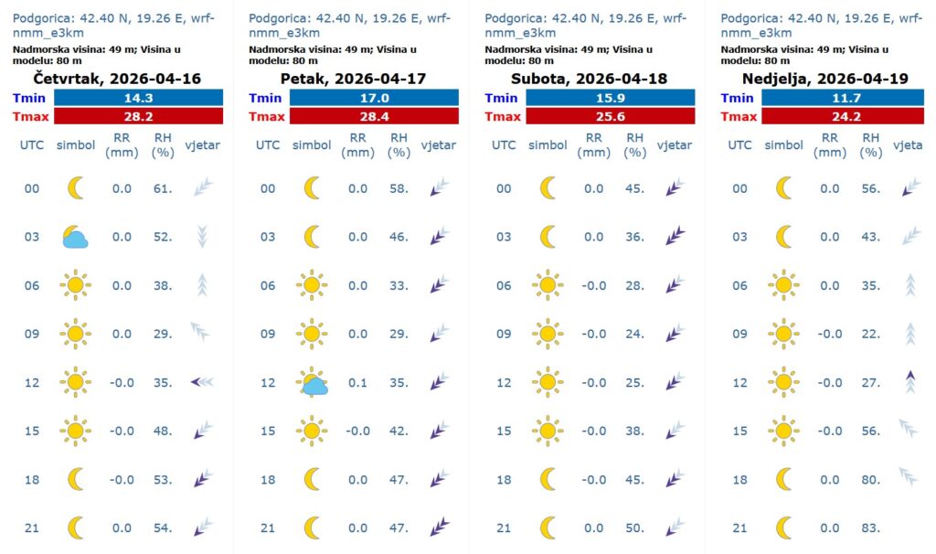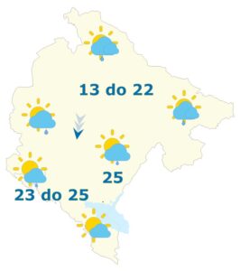 Promjenljivo oblačno, ponegdje kiša ili pljusak sa grmljavinom, uglavnom, u drugom dijelu dana i tokom noći. Vjetar slab do umjeren promjenljivog smjera, krajem dana i tokom noći mjestimično umjeren do pojačan sjeverni. Najviša dnevna temperatura vazduha od 13 do 25 stepeni.