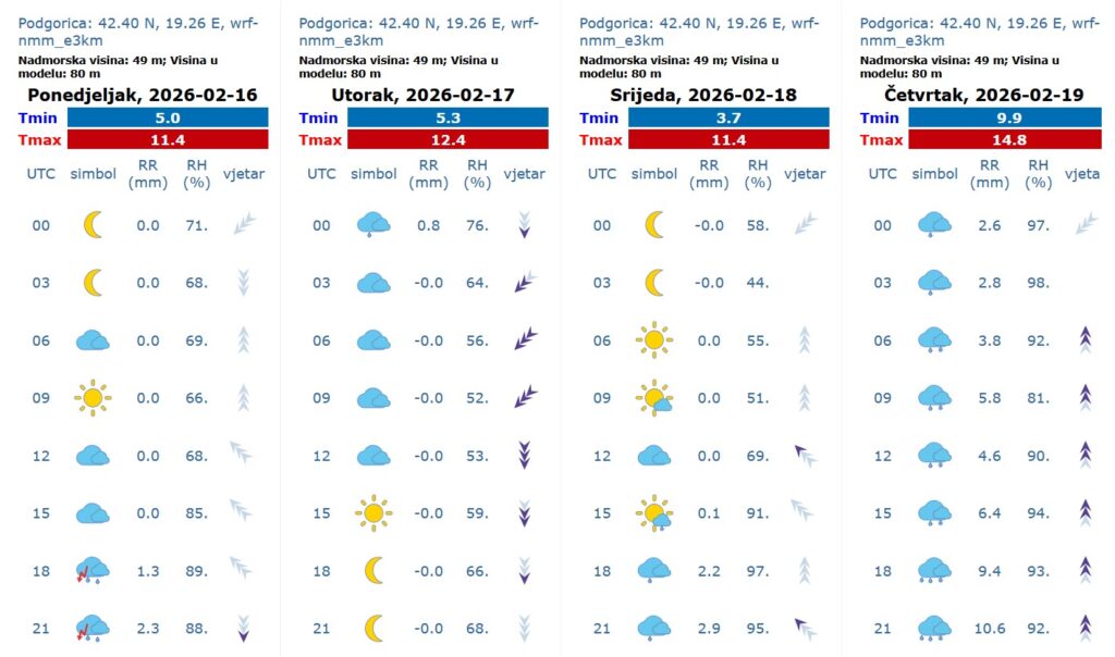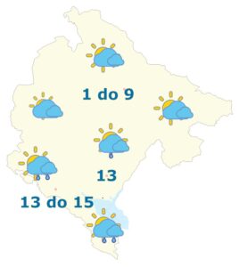 Promjenljivo oblačno sa sunčanim intervalima i tokom većeg dijela dana suvo. Krajem dana i tokom noći jače naoblačenje, koje će usloviti povremeno kišu u južnim i centralnim predjelima i snijeg i susnježicu u sjevernim oblastima. Snijeg je tokom noći moguć i u planinama centralnih i južnih oblasti Crne Gore. Vjetar uglavnom slab do umjeren, pretežno južni. Najviša dnevna temperatura vazduha od 1 do 15 stepeni.
