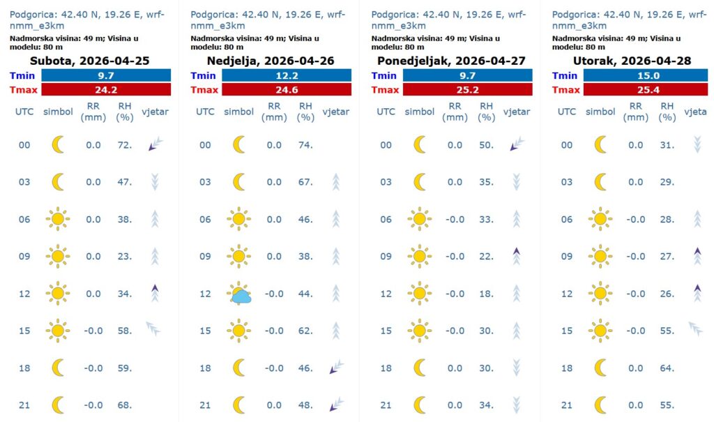 Sunčano ili pretežno sunčano. Vjetar slab do umjeren, promjenljivog smjera. Najviša dnevna temperatura vazduha od 15 do 25 stepeni.
