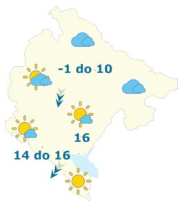 U južnim i centralnim predjelima malo do umjereno oblačno sa dužim sunčanim periodima. Na sjeveru, umjereno do potpuno oblačno, ponegdje moguće i slabe padavine, uglavnom tokom noći. Vjetar sjeverni mjestimično umjeren do jak. Najviša dnevna temperatura vazduha od -1 do 16 stepeni.