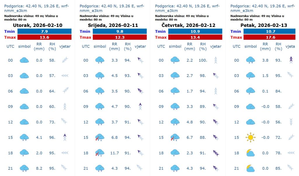 Umjereno do potpuno oblačno, povremeno i mjestimično slaba do umjerena kiša, u južnim predjelima češća i jača u drugom dijelu dana. Na sjeveru u planinama povremeno slab snijeg, a tokom jutra ponegdje po kotlinama moguća magla. Vjetar uglavnom slab do umjeren, južnih smjerova. Najviša dnevna temperatura vazduha od 3 do 15 stepeni.