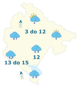 Umjereno do potpuno oblačno, mjestimičnom i povremeno sa kišom, češćom u popodnevnim i noćnim satima. Na jugu, ponegdje su mogući izraženiji pljuskovi, u višim planinskim predjelima na sjeveru, slab snijeg ili susnježica. Vjetar slab do umjeren, na primorju i u sjevernim predjelima povremeno pojačan do jak, pretežno južni i jugoistočni. Najviša dnevna temperatura vazduha od 3 do 15 stepeni.